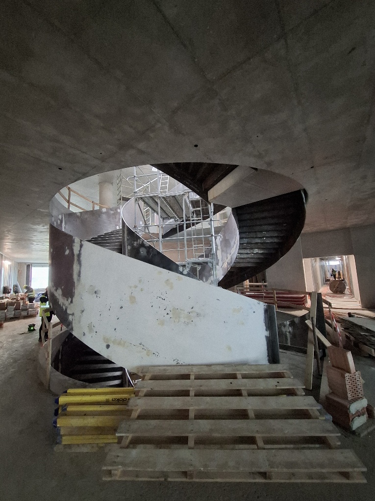V říjnu byl dokončen obvodový plášť a začátkem listopadu bylo odstraněno lešení. Objekt se tak poprvé ukázal v celé své budoucí podobě. Díky zprovozněnému vytápění se nyní stavební činnost přesouvá do interiéru, kde pokračují práce na finálních úpravách.